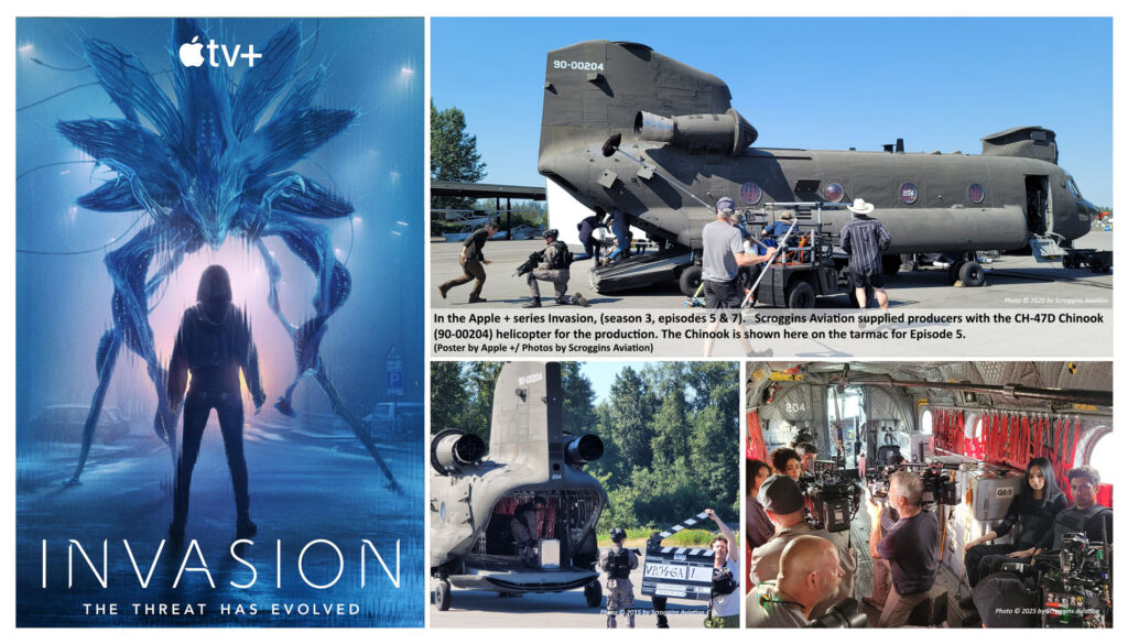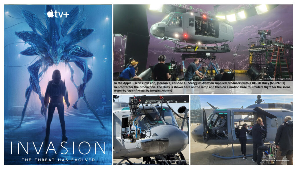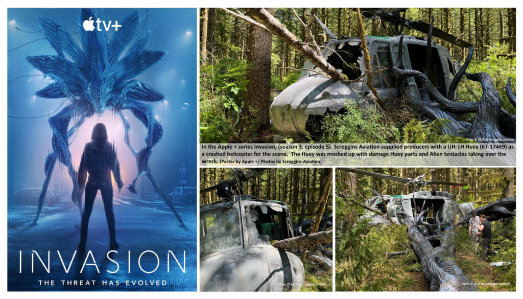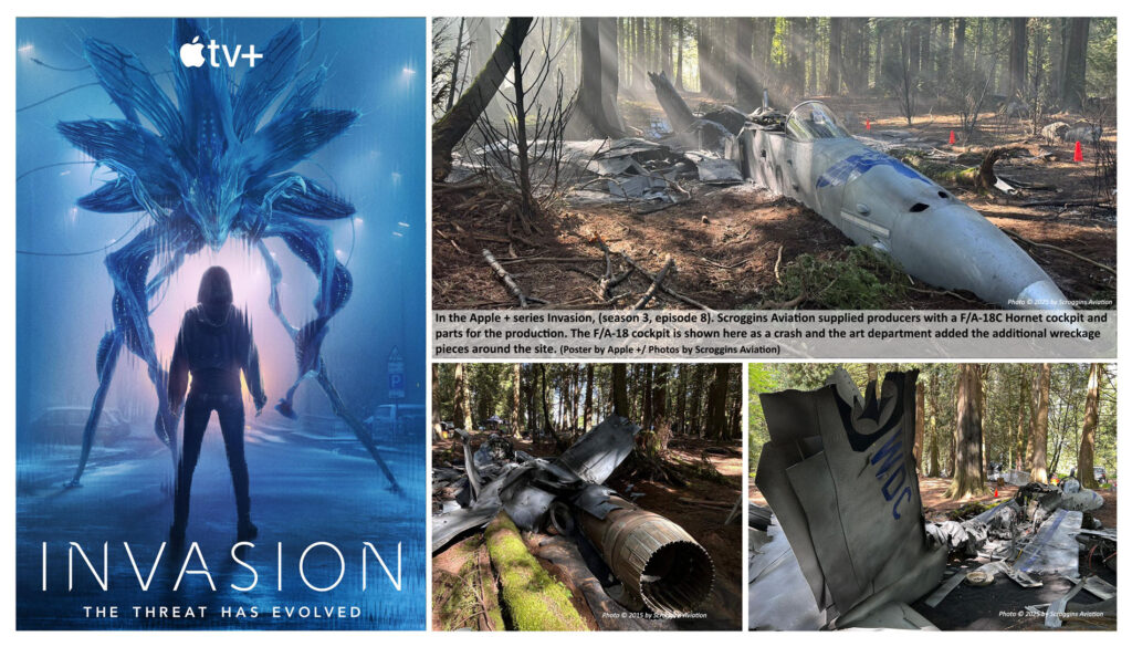 In the Apple + series Invasion, (season 3, episode 8). Scroggins Aviation supplied producers with a F/A-18C Hornet cockpit and parts for the production. The F/A-18 cockpit is shown here as a crash, and the art department added the additional wreckage pieces around the site.